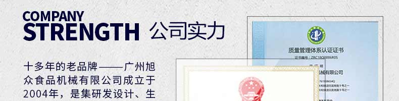 廣州旭眾食品機(jī)械有限公司是一家集科研開(kāi)發(fā),生產(chǎn)設(shè)計(jì),營(yíng)銷(xiāo)服務(wù)為一體的現(xiàn)代化生產(chǎn)企業(yè)?,F(xiàn)代化生產(chǎn)車(chē)間,精湛制造技術(shù),所產(chǎn)機(jī)械歷經(jīng)市場(chǎng)重重考驗(yàn),不斷贏得海內(nèi)外客戶(hù)的贊譽(yù)。