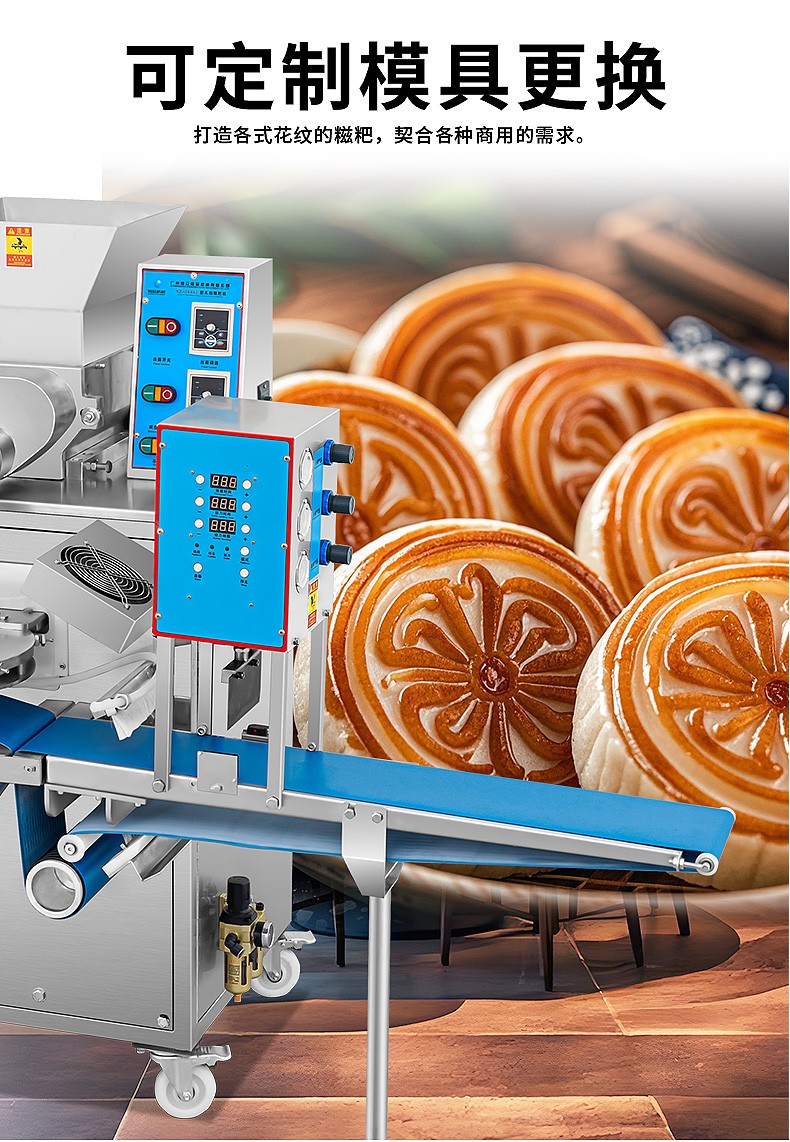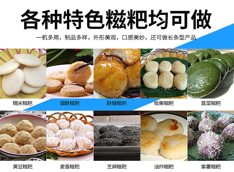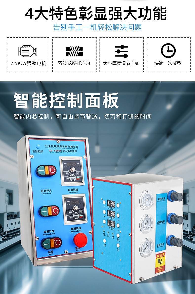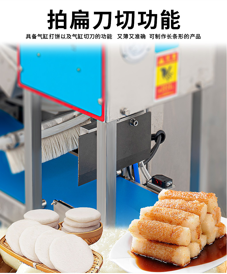 XZ-5000C糍粑機,軟糯細膩、省時省力,不銹鋼糍粑機。智能控制面板,智能內芯控制,可自由調節(jié)輸送,切刀和打餅的時間。拍扁刀切功能,具備氣缸打餅以及氣缸切刀的功能、又薄又準確、可制作長條形的產品。