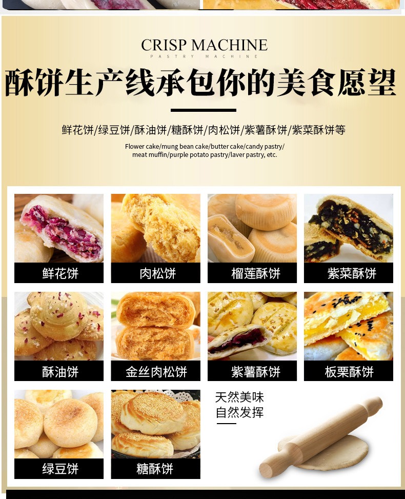 蛋黃酥生產(chǎn)線,酥餅生產(chǎn)線承包你的美食愿望。鮮花餅、綠豆餅、酥油餅、糖酥餅、肉松餅、紫薯酥餅、紫菜酥餅等。每小時(shí)產(chǎn)量高達(dá)5000個(gè),生產(chǎn)速度快、效率高。