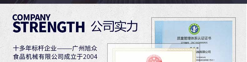 廣州旭眾食品機械有限公司是一家集科研開發(fā),生產(chǎn)設(shè)計,營銷服務為一體的現(xiàn)代化生產(chǎn)企業(yè)?,F(xiàn)代化生產(chǎn)車間,精湛制造技術(shù),所產(chǎn)機械歷經(jīng)市場重重考驗,不斷贏得海內(nèi)外客戶的贊譽。