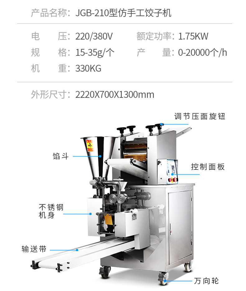 JGB-210型仿手工餃子機,本機采用自動壓面皮包餃子的新工藝技術(shù),本機可生產(chǎn)速凍餃子等,能生產(chǎn)各種肉餡、肉菜混合餡、全菜餡及其他種餡的餃子,適用于餃子館、食品生產(chǎn)廠家、賓館、飯店、餐廳、團體食堂、學校、部隊。免費上門安裝調(diào)試,贈送面點工藝