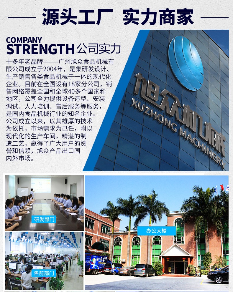 廣州旭眾食品機械有限公司是一家集科研開發(fā),生產(chǎn)設計,營銷服務為一體的現(xiàn)代化生產(chǎn)企業(yè)。現(xiàn)代化生產(chǎn)車間,精湛制造技術(shù),所產(chǎn)機械歷經(jīng)市場重重考驗,不斷贏得海內(nèi)外客戶的贊譽。