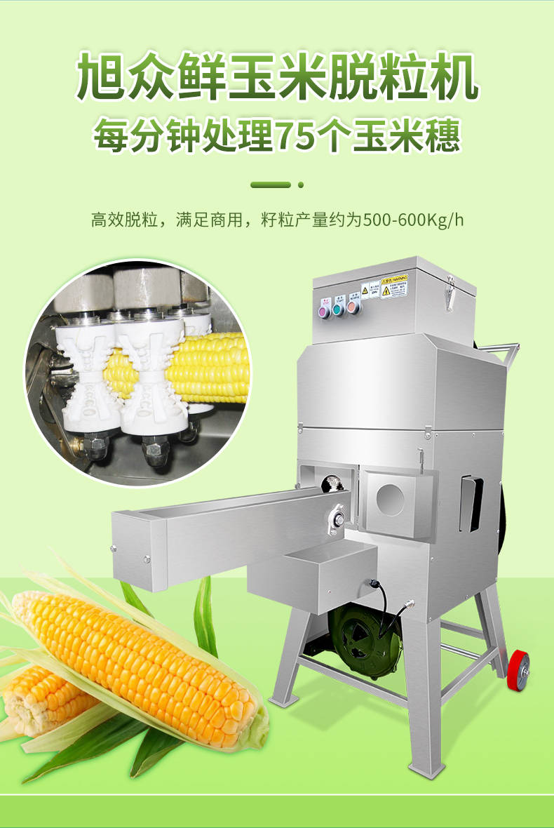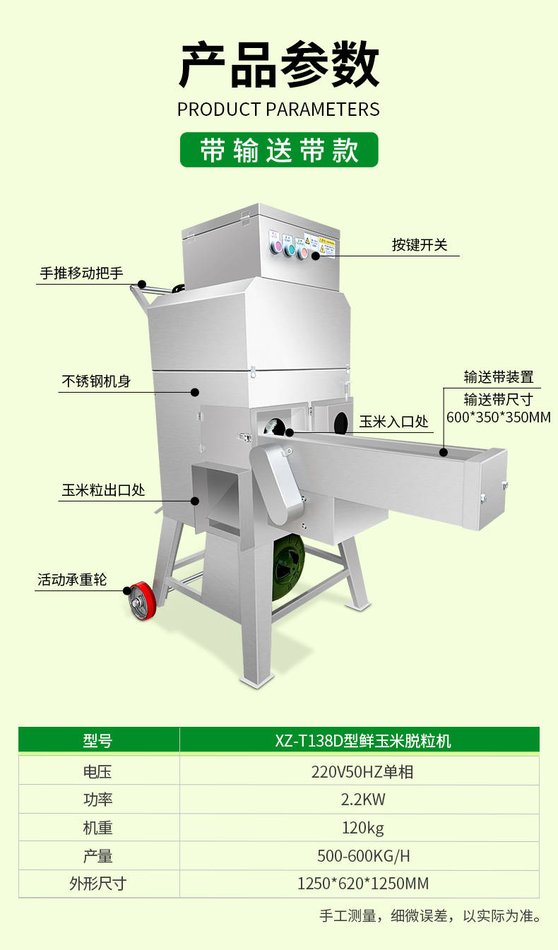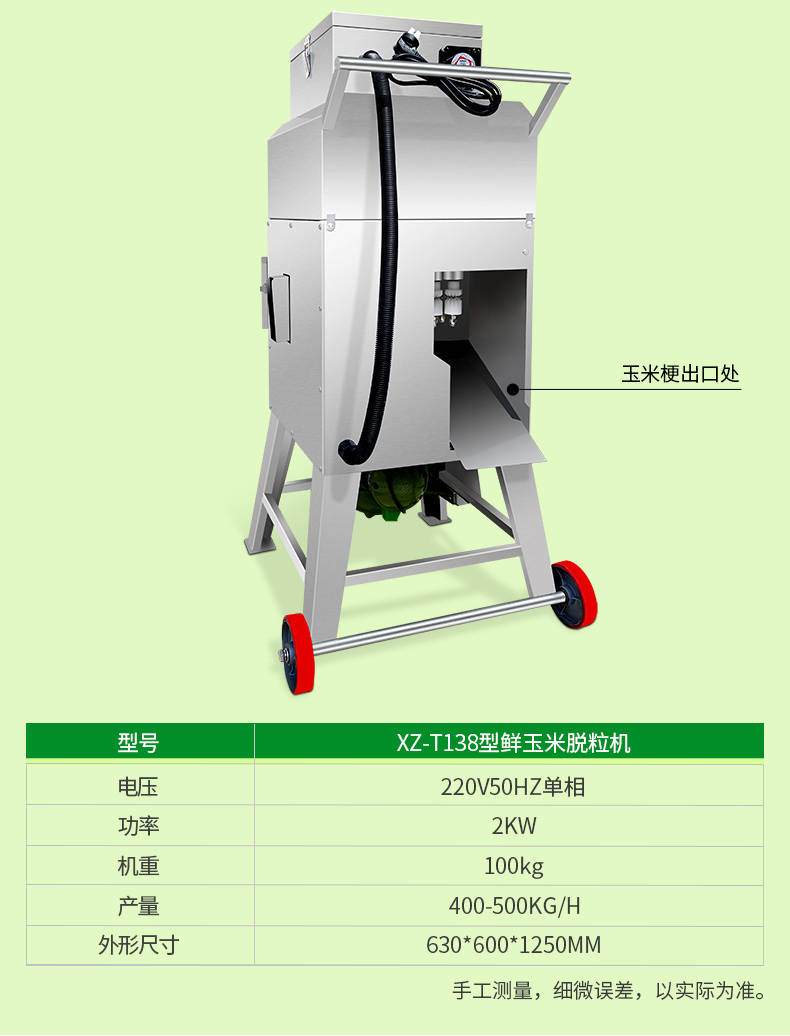 XZ-T138玉米脫粒機,鮮玉米脫粒機,高效脫粒。用于新鮮甜糯玉米脫粒工作,能很方便地把籽粒與梗桿分離。入料方便、脫凈率高、不碎粒不爛芯。每分鐘處理75個玉米穗。高效脫粒,滿足商用,籽粒產(chǎn)量約為500-600Kg/h