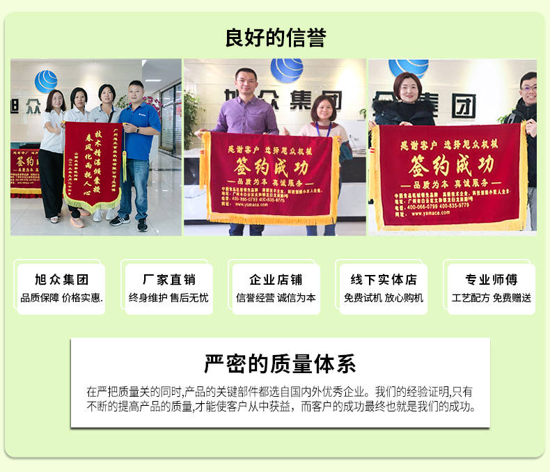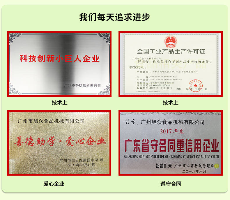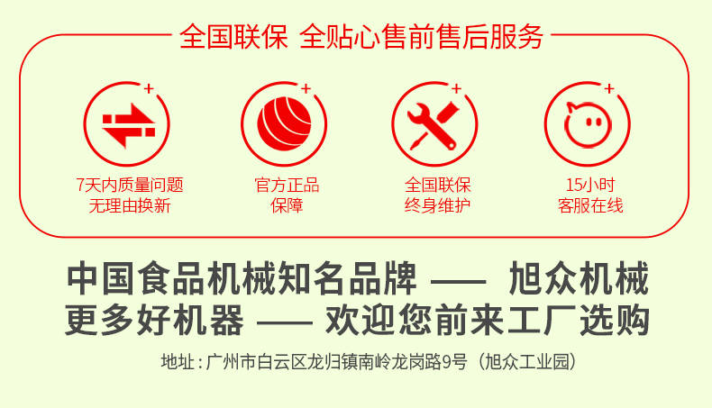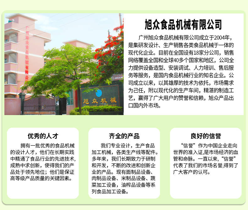 廣州旭眾食品機械有限公司是一家集科研開發(fā),生產(chǎn)設計,營銷服務為一體的現(xiàn)代化生產(chǎn)企業(yè)?,F(xiàn)代化生產(chǎn)車間,精湛制造技術,所產(chǎn)機械歷經(jīng)市場重重考驗,不斷贏得海內(nèi)外客戶的贊譽。