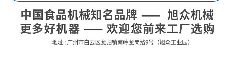 廣州旭眾食品機(jī)械有限公司是一家集科研開發(fā),生產(chǎn)設(shè)計(jì),營銷服務(wù)為一體的現(xiàn)代化生產(chǎn)企業(yè)?,F(xiàn)代化生產(chǎn)車間,精湛制造技術(shù),所產(chǎn)機(jī)械歷經(jīng)市場重重考驗(yàn),不斷贏得海內(nèi)外客戶的贊譽(yù)。
