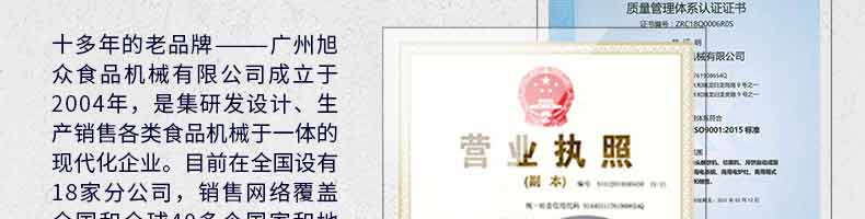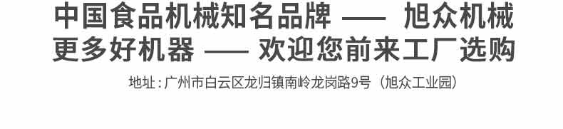 廣州旭眾食品機(jī)械有限公司是一家集科研開發(fā),生產(chǎn)設(shè)計(jì),營(yíng)銷服務(wù)為一體的現(xiàn)代化生產(chǎn)企業(yè)。現(xiàn)代化生產(chǎn)車間,精湛制造技術(shù),所產(chǎn)機(jī)械歷經(jīng)市場(chǎng)重重考驗(yàn),不斷贏得海內(nèi)外客戶的贊譽(yù)。