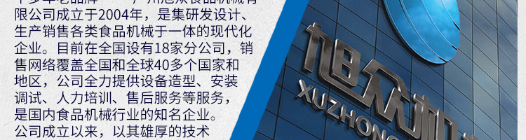 廣州旭眾食品機(jī)械有限公司是一家集科研開發(fā),生產(chǎn)設(shè)計(jì),營(yíng)銷服務(wù)為一體的現(xiàn)代化生產(chǎn)企業(yè)?,F(xiàn)代化生產(chǎn)車間,精湛制造技術(shù),所產(chǎn)機(jī)械歷經(jīng)市場(chǎng)重重考驗(yàn),不斷贏得海內(nèi)外客戶的贊譽(yù)。