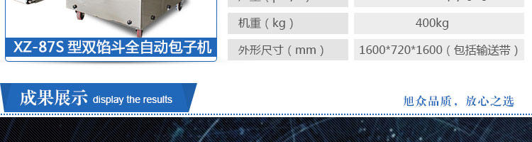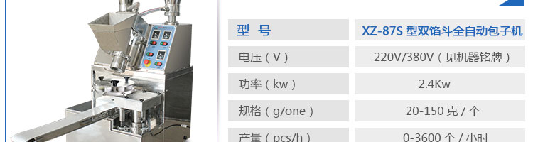 XZ-87S型雙餡斗全自動包子機,可生產(chǎn)各種肉包、肉菜包、菜包、小籠包、湯包、水晶包、圓饅頭、奶黃包、豆沙包、叉燒包、南瓜餅等幾十種包餡制品。適用于賓館、飯店、學(xué)校、機關(guān)企業(yè)食堂、饅頭或包子加工廠、早餐工程店及速凍食品廠等單位??蓾M足不同客戶群體。免費提供工藝技術(shù)。免費上門培訓(xùn)指導(dǎo)安裝。