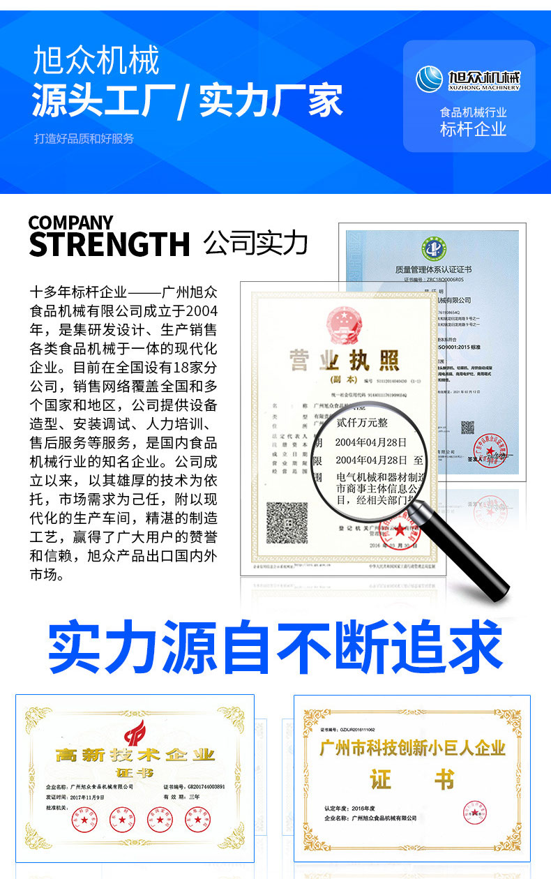 廣州旭眾食品機械有限公司是一家集科研開發(fā),生產設計,營銷服務為一體的現代化生產企業(yè)?,F代化生產車間,精湛制造技術,所產機械歷經市場重重考驗,不斷贏得海內外客戶的贊譽。