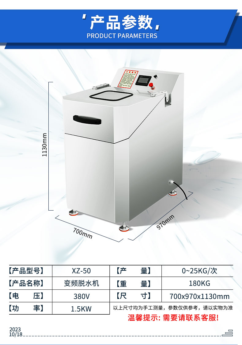 XZ-50型脫水機(jī),蔬菜脫水食品甩干,變頻控制、方便快捷。速度調(diào)頻,脫水速度可根據(jù)不同產(chǎn)品需求調(diào)節(jié)不同速度。鈑金機(jī)身,機(jī)架鈑金是 2MM 厚,使整機(jī)運行時更穩(wěn)定,噪音更小。