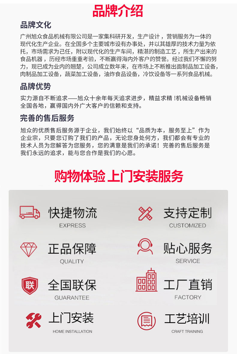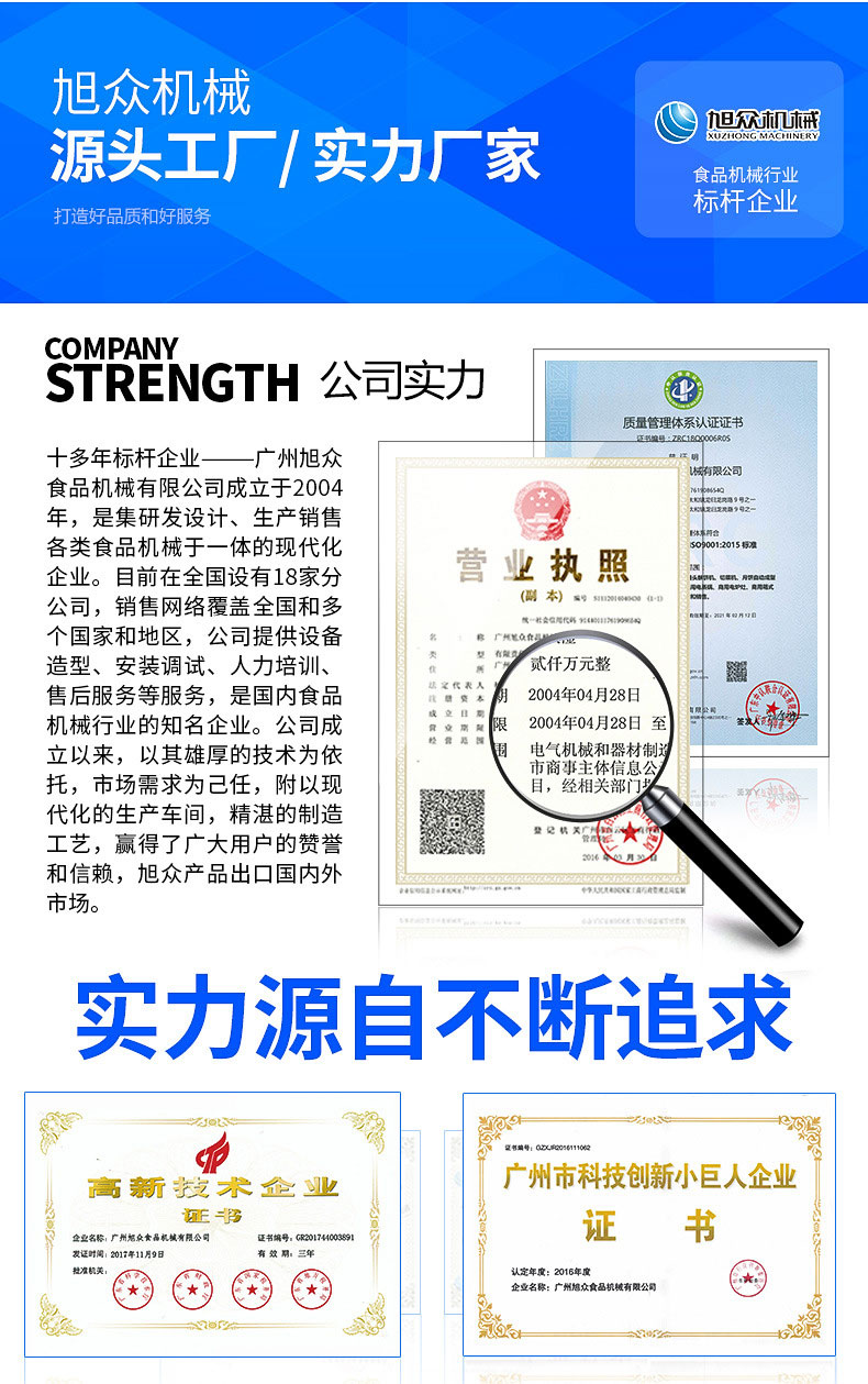 廣州旭眾食品機(jī)械有限公司是一家集科研開發(fā),生產(chǎn)設(shè)計,營銷服務(wù)為一體的現(xiàn)代化生產(chǎn)企業(yè)?,F(xiàn)代化生產(chǎn)車間,精湛制造技術(shù),所產(chǎn)機(jī)械歷經(jīng)市場重重考驗,不斷贏得海內(nèi)外客戶的贊譽(yù)。