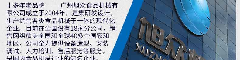 廣州旭眾食品機(jī)械有限公司是一家集科研開發(fā),生產(chǎn)設(shè)計,營銷服務(wù)為一體的現(xiàn)代化生產(chǎn)企業(yè)?,F(xiàn)代化生產(chǎn)車間,精湛制造技術(shù),所產(chǎn)機(jī)械歷經(jīng)市場重重考驗,不斷贏得海內(nèi)外客戶的贊譽(yù)。