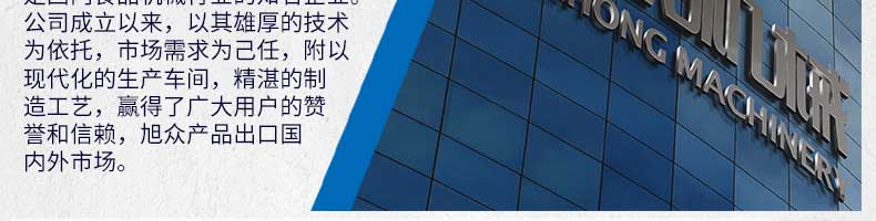 廣州旭眾食品機(jī)械有限公司是一家集科研開發(fā),生產(chǎn)設(shè)計,營銷服務(wù)為一體的現(xiàn)代化生產(chǎn)企業(yè)?,F(xiàn)代化生產(chǎn)車間,精湛制造技術(shù),所產(chǎn)機(jī)械歷經(jīng)市場重重考驗,不斷贏得海內(nèi)外客戶的贊譽(yù)。