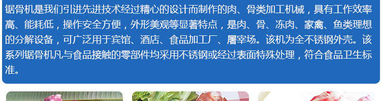 JG-210臺式鋸骨機(jī),適用于各類骨頭,冷凍肉,帶魚骨,冰塊,冷凍魚的分割。采用全不銹鋼材料制作,具有工作效率高,操作安全的特點(diǎn)。廣泛適用于食品加工廠,屠宰場,肉類加工廠等