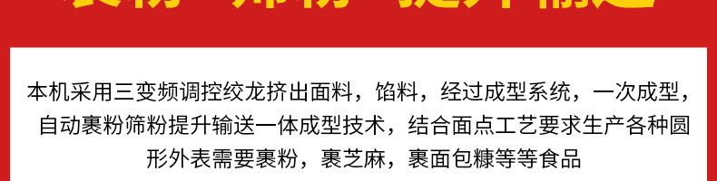 VFD-4000D麻薯機(jī),操作簡單定量準(zhǔn)確只要將面團(tuán)與餡料放入進(jìn)料口,開機(jī)便可包餡、成型,裹粉,篩粉,提升輸送等生產(chǎn)工藝流程。送面、送餡均采用雙絞籠結(jié)構(gòu),數(shù)字變頻調(diào)控,可任意調(diào)節(jié)面、餡輸送量及產(chǎn)品重量。