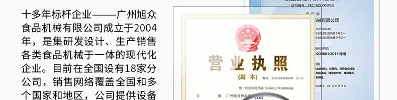 廣州旭眾食品機(jī)械有限公司是一家集科研開發(fā),生產(chǎn)設(shè)計(jì),營(yíng)銷服務(wù)為一體的現(xiàn)代化生產(chǎn)企業(yè)?,F(xiàn)代化生產(chǎn)車間,精湛制造技術(shù),所產(chǎn)機(jī)械歷經(jīng)市場(chǎng)重重考驗(yàn),不斷贏得海內(nèi)外客戶的贊譽(yù)。