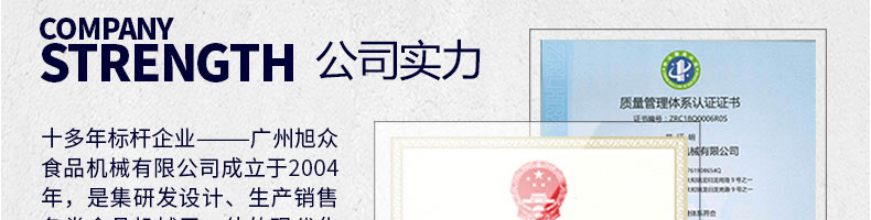 廣州旭眾食品機械有限公司是一家集科研開發(fā),生產設計,營銷服務為一體的現(xiàn)代化生產企業(yè)?,F(xiàn)代化生產車間,精湛制造技術,所產機械歷經市場重重考驗,不斷贏得海內外客戶的贊譽。