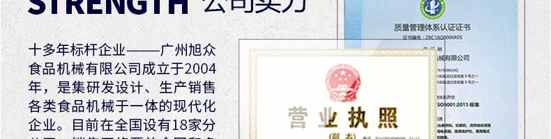 廣州旭眾食品機(jī)械有限公司是一家集科研開發(fā),生產(chǎn)設(shè)計,營銷服務(wù)為一體的現(xiàn)代化生產(chǎn)企業(yè)。現(xiàn)代化生產(chǎn)車間,精湛制造技術(shù),所產(chǎn)機(jī)械歷經(jīng)市場重重考驗,不斷贏得海內(nèi)外客戶的贊譽(yù)。