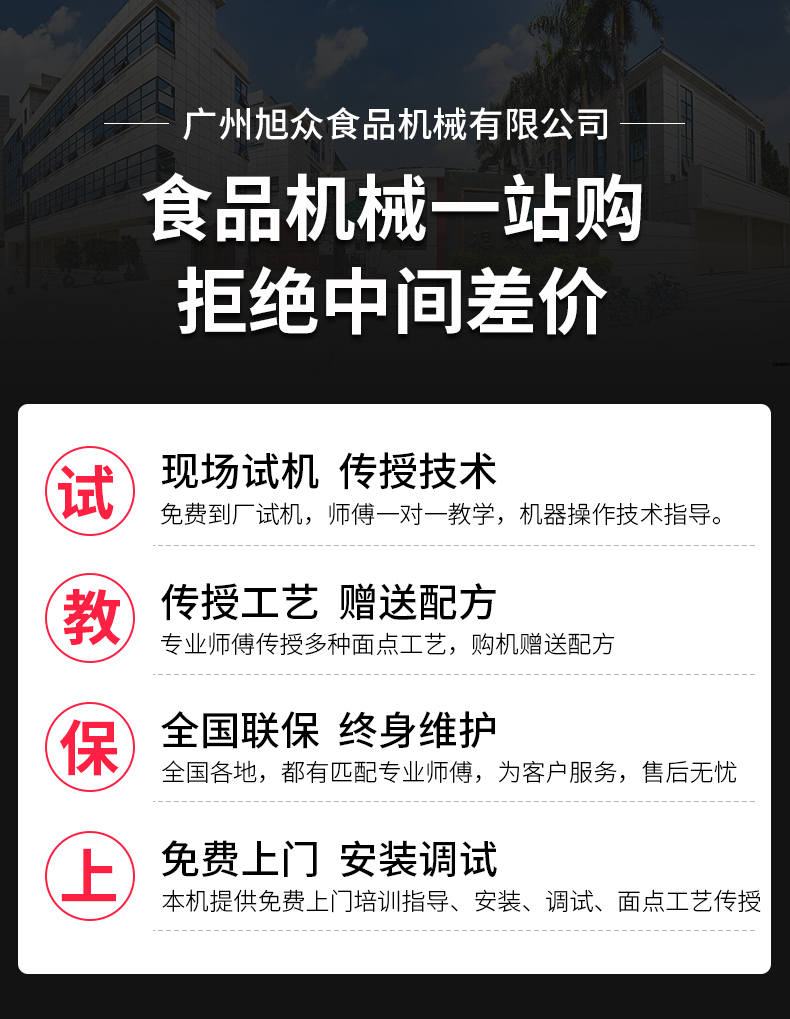 廣州旭眾食品機械有限公司是一家集科研開發(fā),生產(chǎn)設(shè)計,營銷服務(wù)為一體的現(xiàn)代化生產(chǎn)企業(yè)?,F(xiàn)代化生產(chǎn)車間,精湛制造技術(shù),所產(chǎn)機械歷經(jīng)市場重重考驗,不斷贏得海內(nèi)外客戶的贊譽。