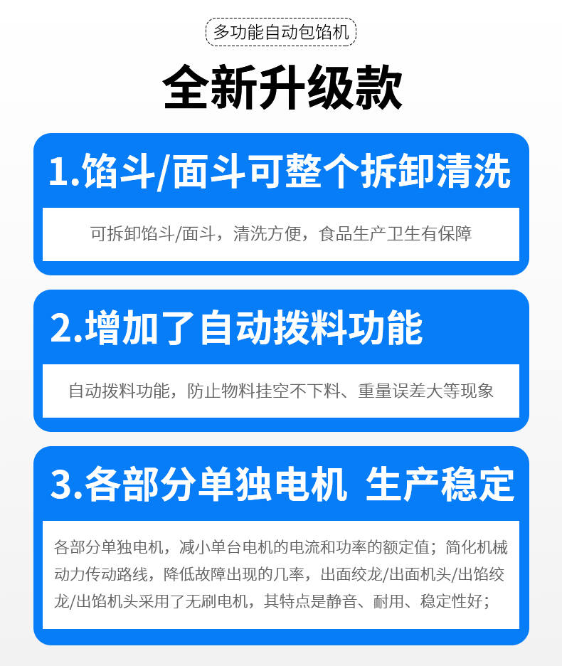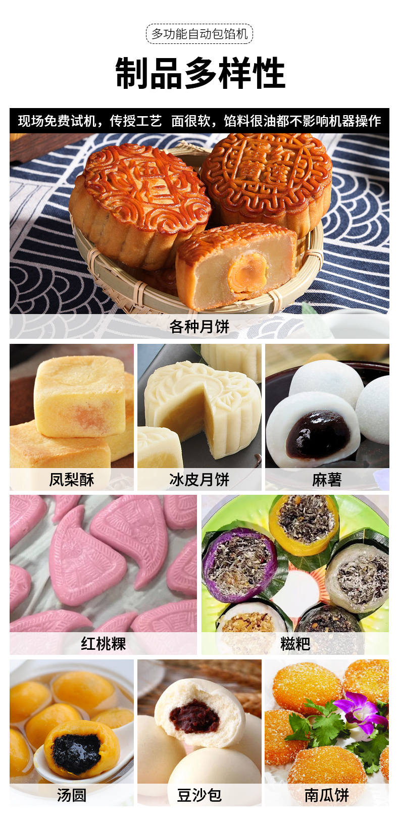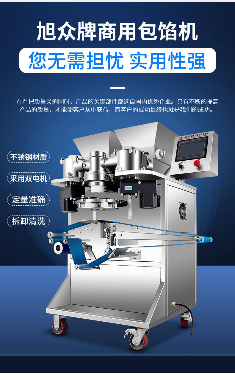 SZ-69型多功能自動包餡機,餡斗/面斗,可整個拆卸清洗,增加了自動拔料功能。月餅鳳梨酥紅桃裸湯圓南瓜餅軟餡餅。在嚴(yán)把質(zhì)量關(guān)的同時,產(chǎn)品的關(guān)鍵部件都選自國內(nèi)優(yōu)秀企業(yè)。只有不斷的提高產(chǎn)品的質(zhì)量,才能使客戶從中獲益,而客戶的成功最終也就是我們的成功。